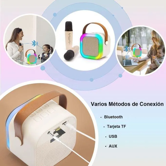 Fonction 4 en 1 – Cette mini machine de karaoké compacte intègre un haut-parleur de qualité HD, deux microphones sans fil et des effets sonores professionnels pour une expérience de chant immersive. Facile à utiliser grâce à son bouton unique et sa poignée en cuir, elle est à la fois confortable et pratique à transporter.